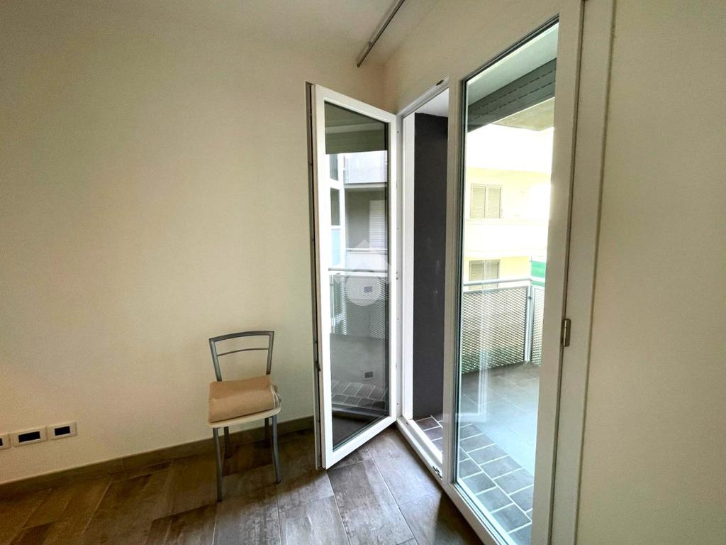 L'appartamento è composto da un soggiorno con cucina a vista e affaccio diretto su un terrazzo vivibile, un corridoio che conduce alla camera matrimoniale con accesso diretto al balcone, alla camera doppia e ad un bagno dotato di box doccia .