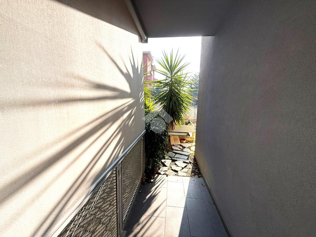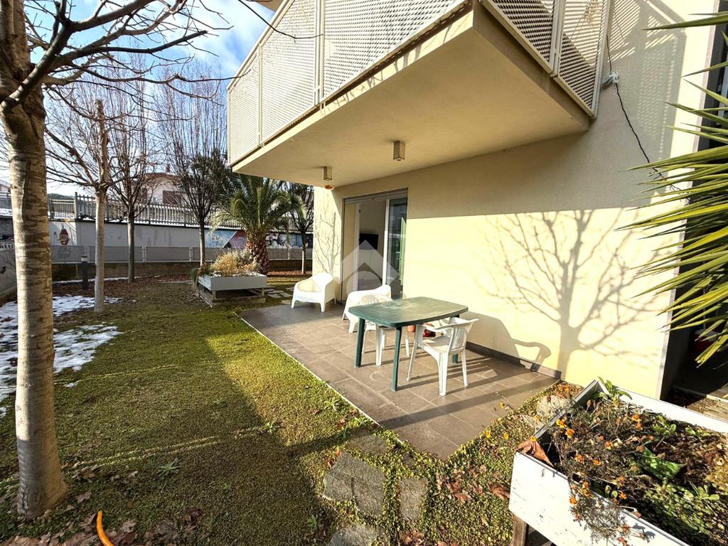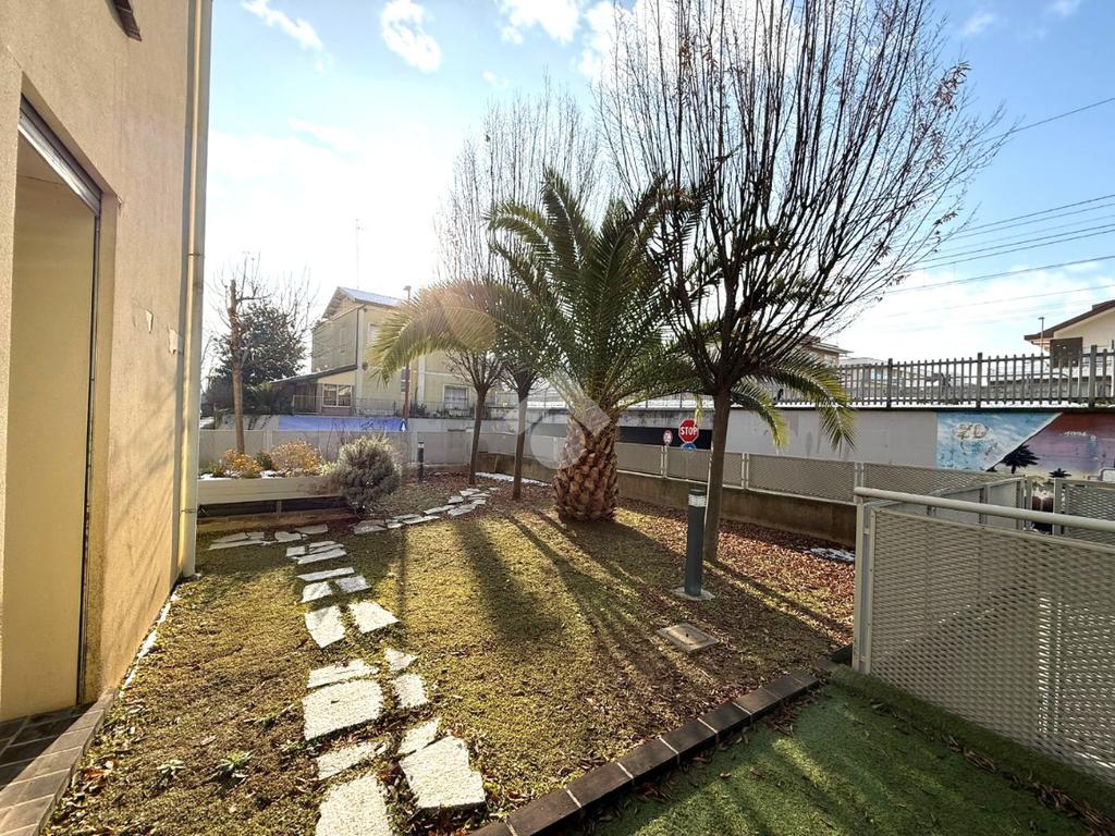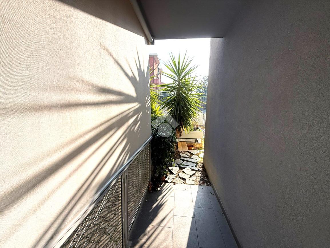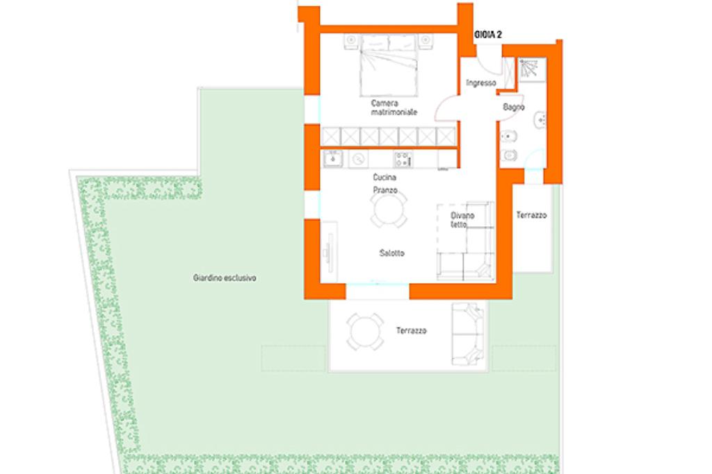 L'appartamento è composto da un soggiorno con cucina a vista e affaccio diretto su giardino privato di 122 mq , un corridoio che conduce alla camera matrimoniale con accesso diretto al giardino e un bagno finestrato dotato di box doccia .